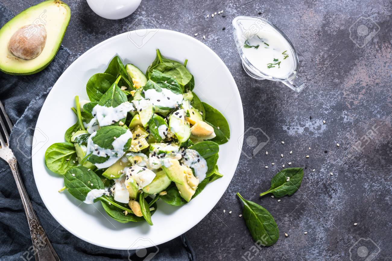 Green Salad With Avocado Spinach Egg And Cucumber Stock Photo Alamy - Avocado egg salad puts a delicious twist to the basic egg salad recipe.